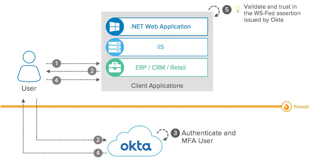 - À l'aide de WS-Fed, l'utilisateur tente d'accéder aux applications client protégées par Okta.