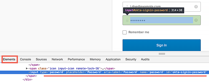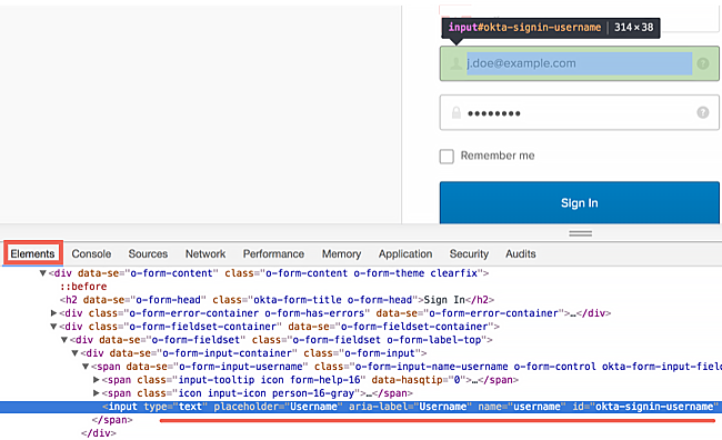 Il est possible que vous ayez besoin de la hiérarchie complète lorsque vous ne pouvez pas identifier de façon unique les éléments par les attributs id ou class. Pour la page de connexion d'Okta, les sélecteurs seraient les suivants :