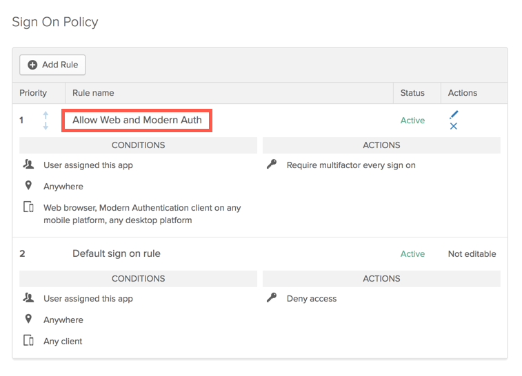 La règle d'authentification par défaut d'Office 365 est différente de celle des autres applications d'Okta. Cette règle refuse l'accès à tous les clients provenant de n'importe quel réseau. Elle ne peut pas être modifiée. Elle empêche les clients qui utilisent l'authentification héritée d'accéder à Office 365.