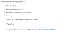 Vous pouvez filtrer certains clients dans une règle d'authentification à l'application Office 365 afin de leur autoriser ou de leur refuser l'accès aux ressources Office 365. Ce filtre est particulièrement pratique si vous souhaitez refuser l'accès à certains clients non approuvés ou non pris en charge. Vous pouvez également utiliser ce filtre pour autoriser uniquement les clients approuvés. Il vous permet d'exercer un contrôle plus précis sur les clients qui ont accès à votre application Office 365.