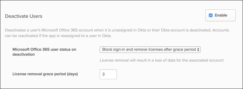 Le menu déroulant Statut de l'utilisateur Microsoft Office 365 lors de la désactivation apparaît alors.