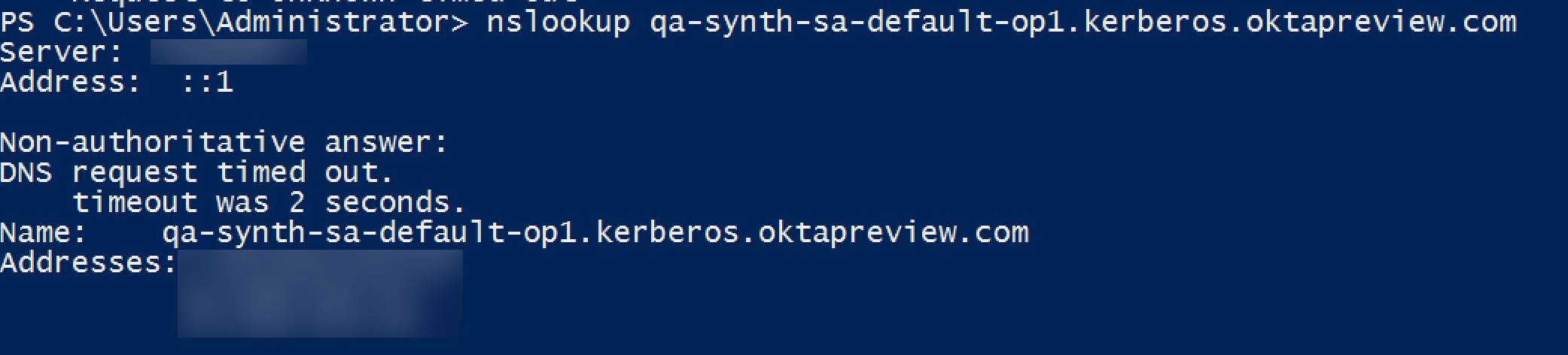 $ nslookup <yourorg>.kerberos.<oktaorgtype>.com