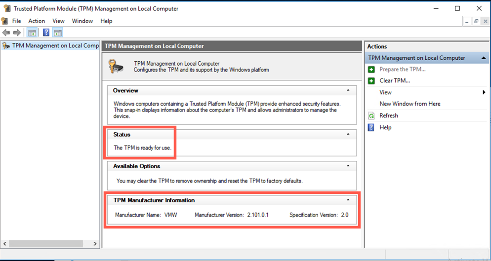 Il peut être utile de vérifier le statut de TPM. Pour ce faire, ouvrez la console Gestion TPM à partir d'une invite de commande ou du menu Démarrer.