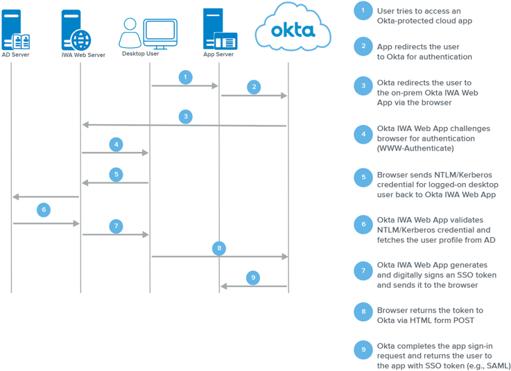 L’agent Web IWA Okta est un agent Web léger pour Internet Information Services (IIS) qui permet l'authentification unique de bureau (DSSO) sur le service Okta. La DSSO permet aux utilisateurs d'être automatiquement authentifiés par Okta et toutes les applications auxquelles ils accèdent via Okta dès qu'ils se connectent à un réseau Windows.
