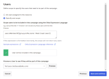 Assurez-vous que votre expression personnalisée donne une valeur booléenne : True (Vrai) doit inclure les utilisateurs et False (faux) doit les exclure de la campagne. Consultez la section Langage d'expression Okta pour obtenir de plus amples informations.