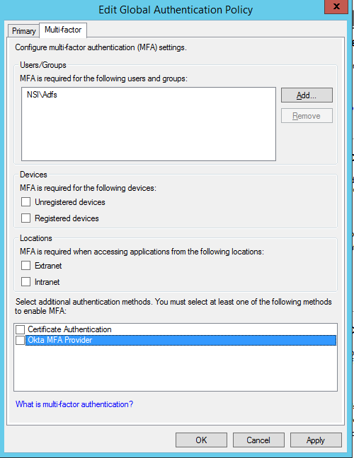 - Ouvrez la politique d'authentification globale ADFS pour modification, puis sélectionnez l'onglet Multifacteur .