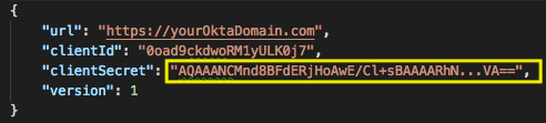 La valeur clientSecret de votre fichier okta_adfs_farm.json doit être un tableau JSON de chaînes protégées :