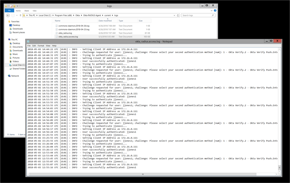 Accédez aux journaux de l'agent Okta RADIUS, comme indiqué :