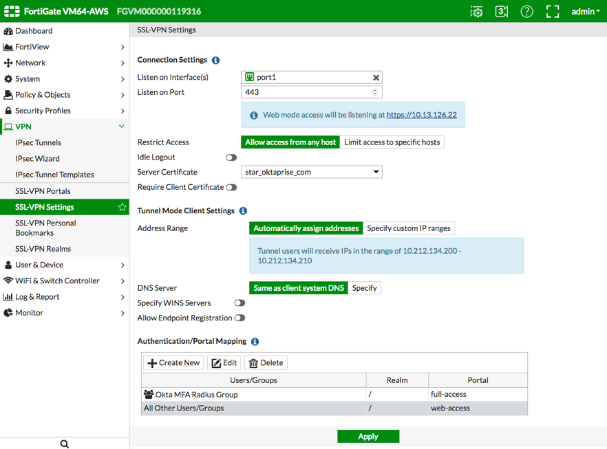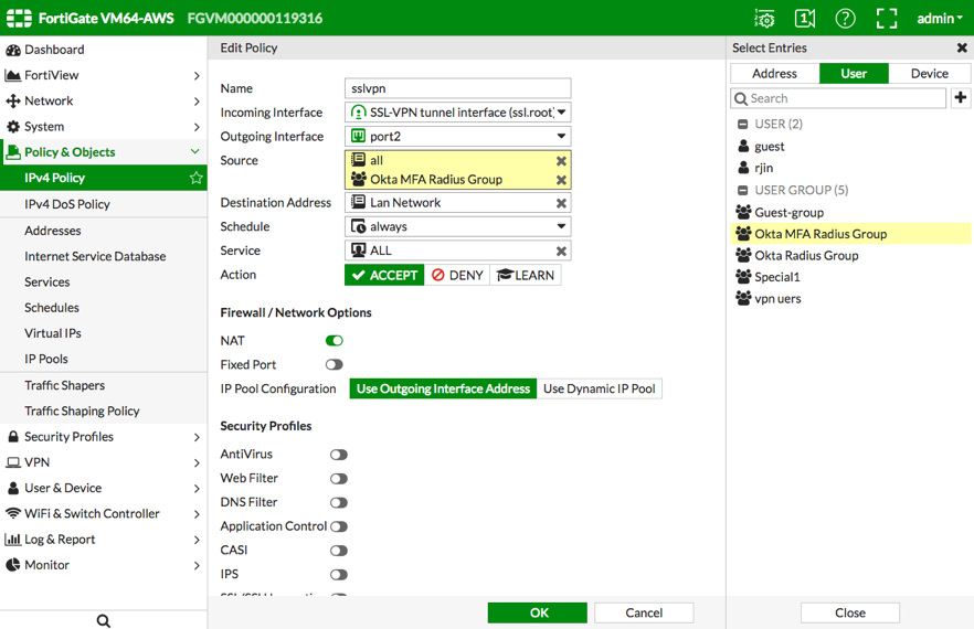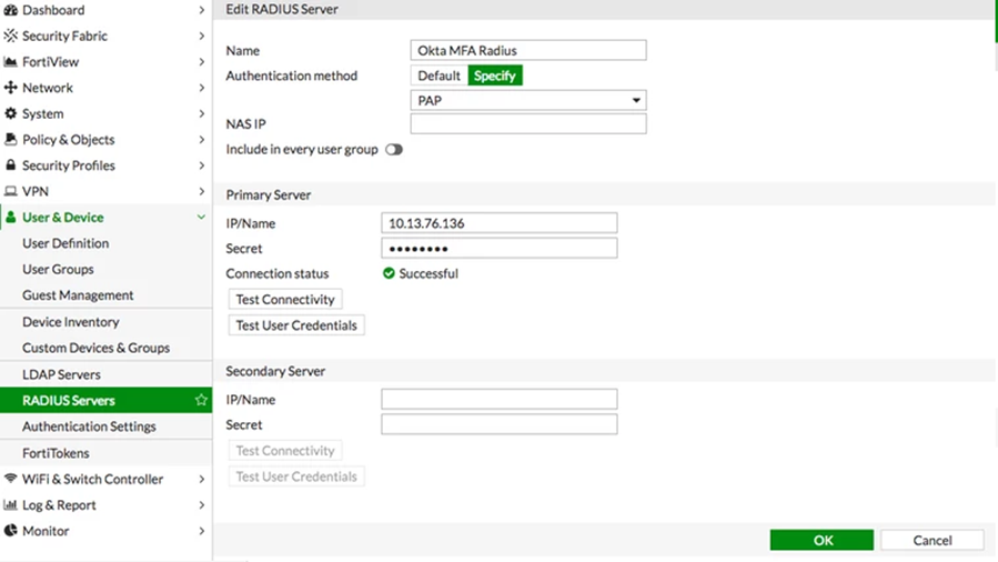 config user radius edit "Okta MFA RADIUS" set server "10.20.251.19" set secret MyRadiusSecretKey set radius-port 1814 set auth-type pap next end