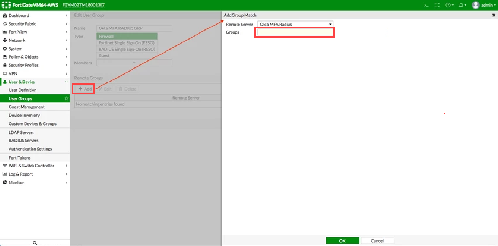 Champ Valeur Nom Un nom unique et approprié (Groupe Okta MFA RADIUS) Type Pare-feu Membres à authentification unique Vide Groupes à distance Créer un nouveau
