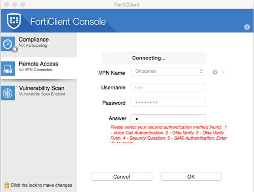 Il existe deux tests qui permettent de vérifier si l'appliance VPN SSL Fortinet est configurée de manière à bien fonctionner avec Okta.