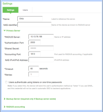 Serveur RADIUS IP ou nom de l'agent du serveur RADIUS Okta Port d'authentification Le port UDP Clé secrète partagée La clé secrète pour l'accès au port Adresse du serveur IP ou nom de l'agent du serveur RADIUS Okta Port de gestion Obligatoire, mais toute valeur est acceptable Adresse IPv5 NAS Facultatif. Affichée dans les journaux Okta, si définie Délai d'expiration Recommandé : 60 secondes Tentatives 1 - Facultatif. À titre facultatif, reprenez ces paramètres pour le serveur de sauvegarde, au besoin et en fonction des disponibilités.