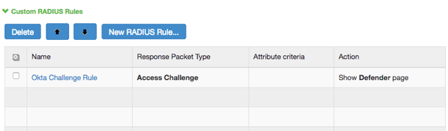 Nom Nom unique (par exemple, Règle des vérifications Okta). Si vous avez reçu un paquet réponse RADIUS Sélectionnez Défi d'accès. Critères de l'attribut Attribut RADIUS : sélectionnez Reply-Message (18)