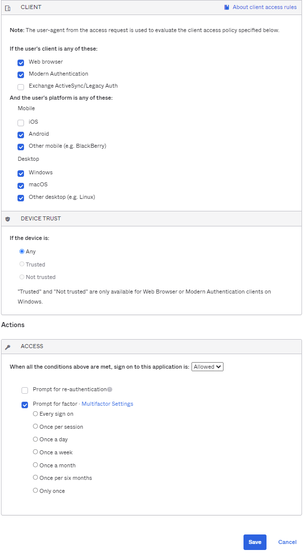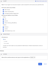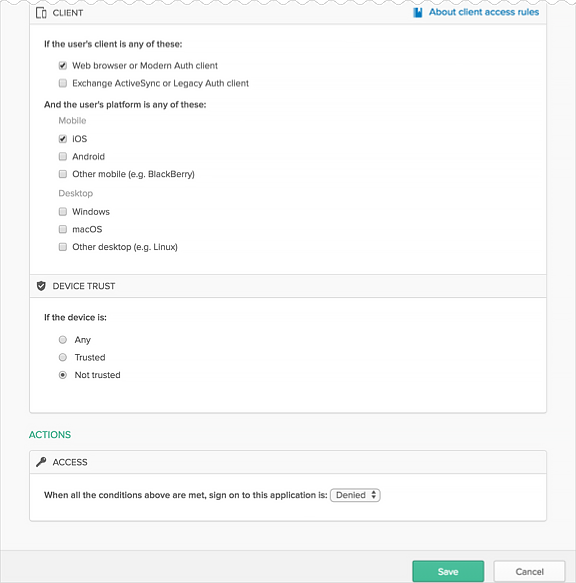 Remarque : cet exemple présente les règles Device Trust pour la gestion de l'accès à Office 365. Pour les autres applications, notez que la section Si le client de l'utilisateur est l'un des suivants n'est pas présente.