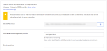 - Dans le champ Fournisseur de gestion des appareils mobiles, ajoutez ou modifiez le nom de votre fournisseur MDM. Le contenu de ce champ est affiché aux utilisateurs finaux lorsqu'ils inscrivent leur appareil.