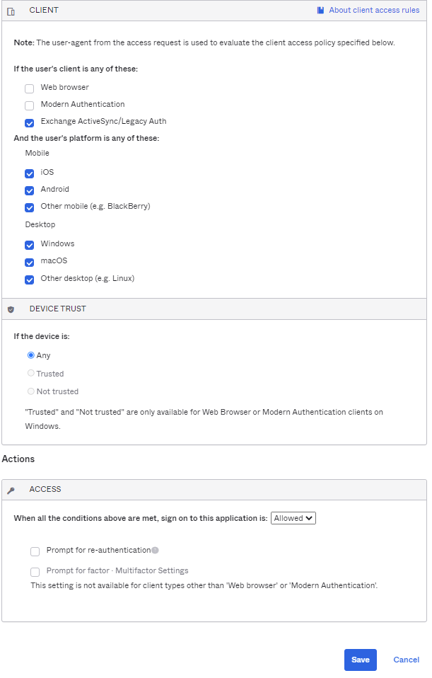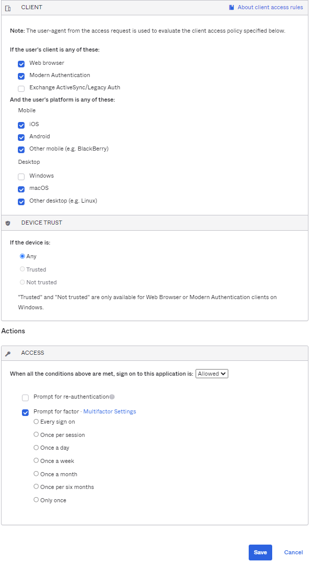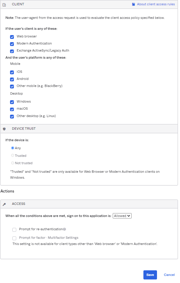 Avant de demander au Support Okta de désactiver Okta Device Trust for Windows, assurez-vous d'abord de modifier le paramètre Device Trust dans les règles de la politique d'authentification à l'application sur N'importe lequel. Ce paramètre se trouve dans .