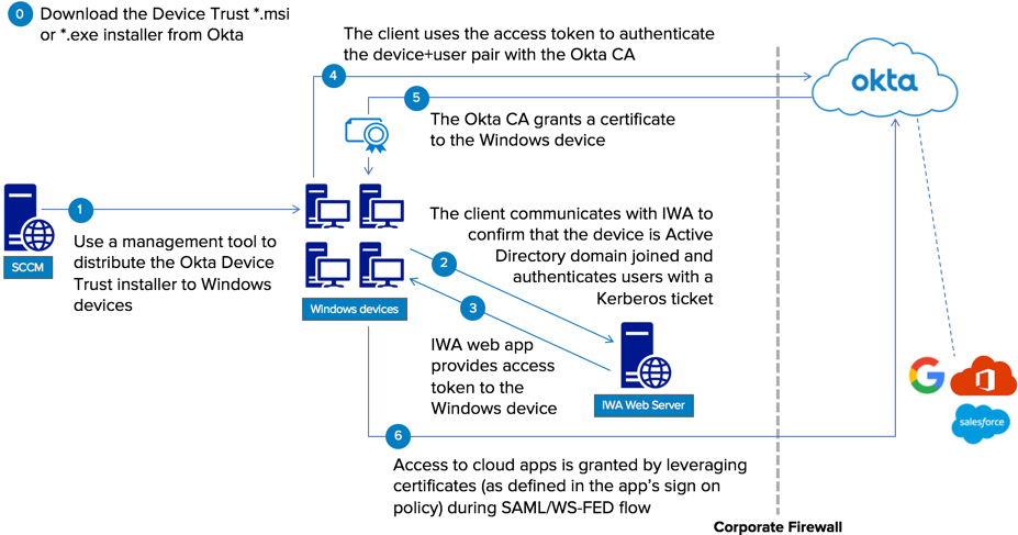 Okta Device Trust for Windows utilise l'application Web IWA pour confirmer la position de sécurité des ordinateurs et des utilisateurs Windows en vérifiant que les deux sont joints à votre domaine Active Directory. Okta délivre alors un certificat à l'ordinateur Windows qui active les flux Device Trust vers les applications fédérées par Okta.