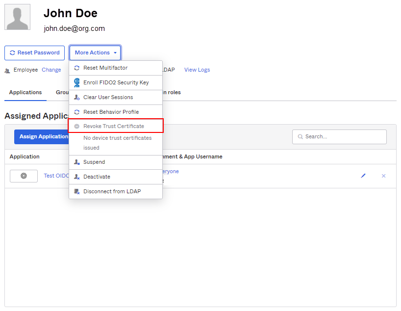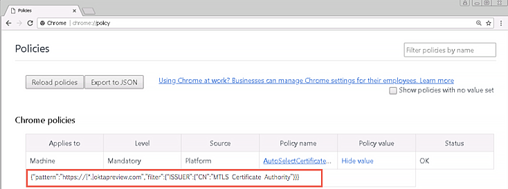 Okta Device Trust pour Windows + IWA basée sur des certificats pour la SSO : la configuration de cette solution Device Trust peut entraîner un problème d'incompatibilité si votre org est configurée avec l'application IWA basée sur des certificats pour prendre en charge la SSO pour les appareils mobiles iOS et Android.