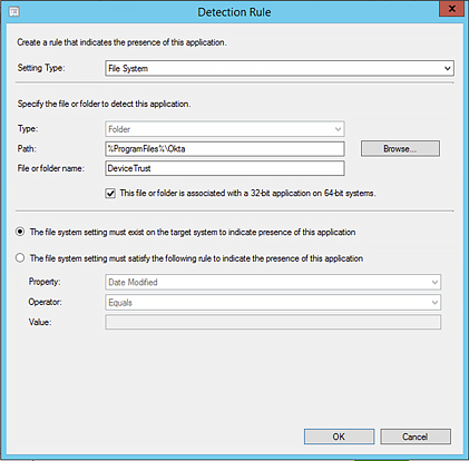 Veillez à spécifier soit File System (Système de fichiers), soit Registry (Registre) dans votre Detection Rule (Règle de détection). N'utilisez pas le type de paramètre Programme d'installation Windows pour détecter l'installation, car SCCM ne peut pas détecter la Tâche d'enregistrement d'appareil via ce paramètre.