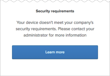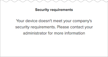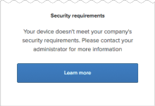 Si les certificats ne sont pas installés et que le paramètreApprouvé est activé, les utilisateurs se voient refuser l'accès à l'application et sont redirigés vers un message de sécurité leur conseillant de contacter leur administrateur. Vous pouvez configurer le message de manière à ce qu'il contienne un lien En savoir plus pour obtenir plus d'informations. Voir Activer le paramètre global Device Trust pour votre organisation.