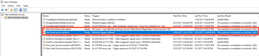 - Vérifiez que les tâches okta-devicetrust-devicetask et okta-devicestrust-usertask apparaissent et se sont terminées avec succès.