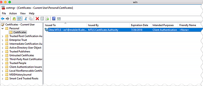 Pour vérifier l'inscription des certificats, Okta vous recommande d'utiliser votre outil de gestion pour analyser l'observateur d'événements Windows, ou d'utiliser une ligne de commande pour interroger directement le magasin de certificats de l'utilisateur. Recherchez le certificat Okta MTLS.