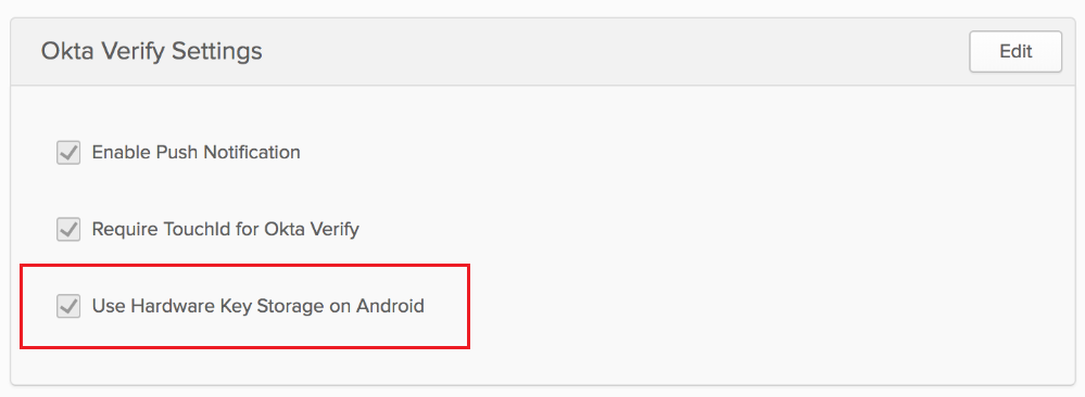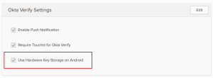 - Dans Okta Verify Paramètres, cliquez sur Modifier. Les paramètres peuvent varier selon l'org.