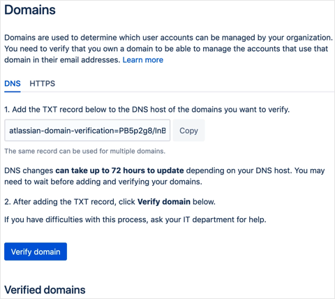 - Pour l'application Atlassian Cloud, les comptes utilisateur peuvent uniquement être envoyés s'ils utilisent un domaine qui peut être vérifié à l'aide de votre organisation Atlassian. Au niveau d'une organisation Atlassian, vous devez vérifier que vous disposez d'un domaine pour pouvoir envoyer et gérer des comptes à l'aide de ce dernier :