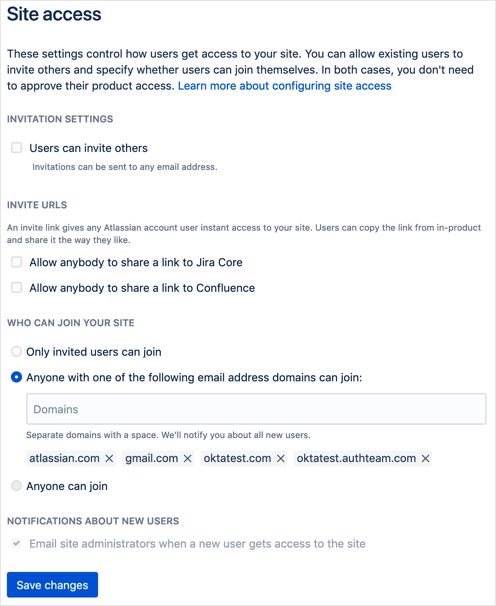 - Au niveau du site Atlassian, les utilisateurs de chaque domaine auquel vous accordez l'accès peuvent être ajoutés au site. Vous n'avez pas à vérifier que vous disposez d'un domaine au niveau de l'organisation Atlassian :