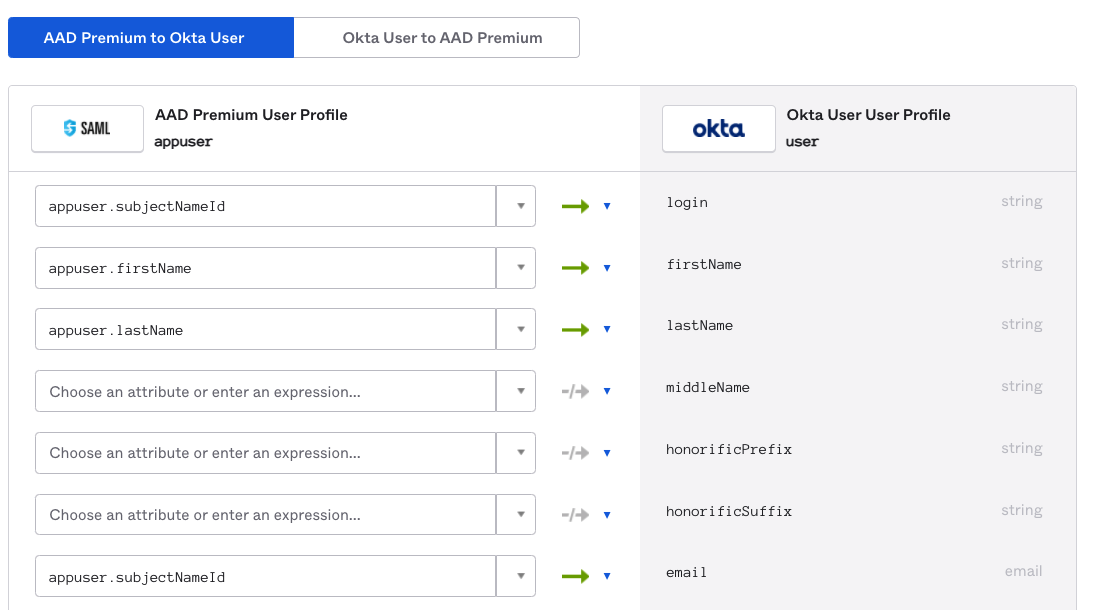 Pour utiliser Microsoft Entra ID ou l'authentification de l'utilisateur, vous devez mapper les attributs utilisateur Microsoft Entra ID avec les attributs Okta .
