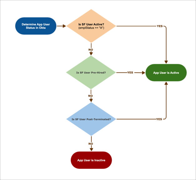| Statut de l'utilisateur | Le statut d'un utilisateur est obtenu à partir de l'entité Job Information dans Employee Central. Si le champ job_information.emplStatus d'un utilisateur est défini sur A, celui-ci est considéré comme actif dans Okta. Si le statut d'un utilisateur n'est pas actif dans l'entité Job Information, Okta effectue une deuxième vérification sur le champ job_information.start_date de l'utilisateur. Si la date de début de l'utilisateur tombe dans la période de l'intervalle de préembauche, l'utilisateur est identifié comme un utilisateur préembauché actif dans Okta. Okta sélectionne la valeur la plus ancienne enregistrée dans job_information pour chaque utilisateur, et effectue la vérification suivante : now > startDate > now + preHireInterval . Si la condition est vraie, l'utilisateur est considéré comme actif. Si un utilisateur est inactif et qu'il ne passe pas la vérification préalable à l'embauche, une vérification postérieure à l'arrêt est effectuée. Okta sélectionne la valeur la plus récente de *___job_information___start_date (date de début de l'arrêt) et la vérifie en la comparant à inactiveStartDate < (now - postTerminationInterval). Si un utilisateur échoue à toutes les vérifications, il est identifié comme étant inactif et n'est pas importé dans Okta. Le diagramme suivant illustre le workflow de vérification du statut de l'utilisateur Okta :