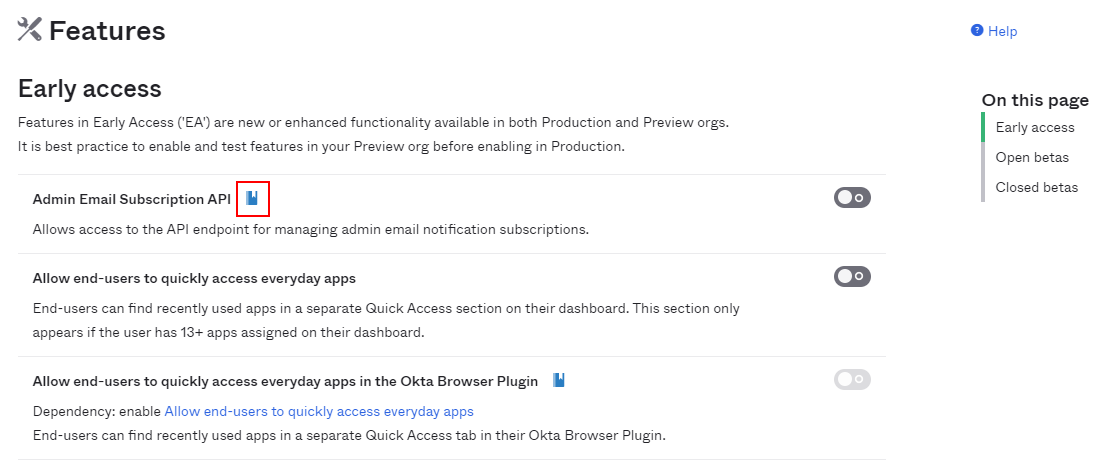 Un super administrateur peut contourner le support Okta et activer une fonctionnalité bêta ou d'accès anticipé en libre-service pour leur org.