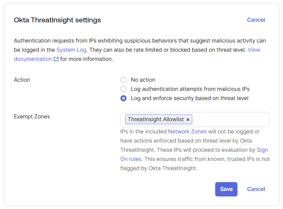 Configurez les paramètres d'Okta ThreatInsight. Voir Configurer Okta ThreatInsight.