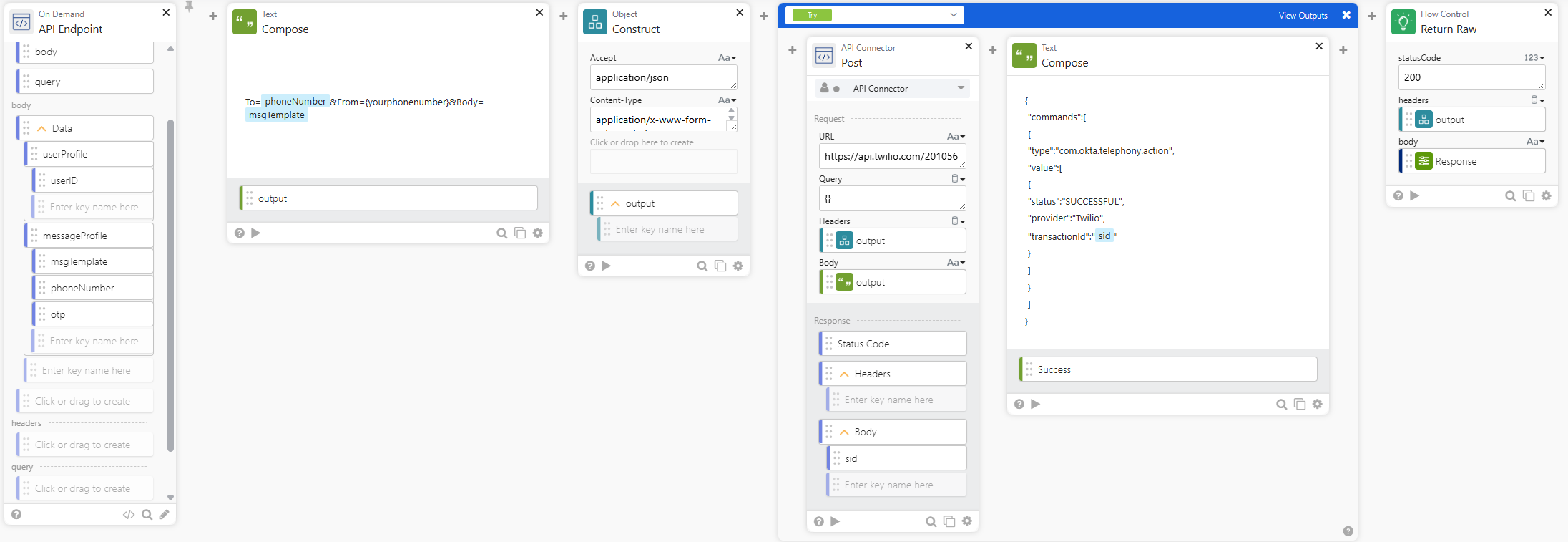 Cette tâche explique comment créer un flux dans Okta Workflows pour envoyer le code d'accès à usage unique (OTP) à vos utilisateurs finaux via l'opérateur téléphonique de votre choix. Le flux ressemble à ceci :