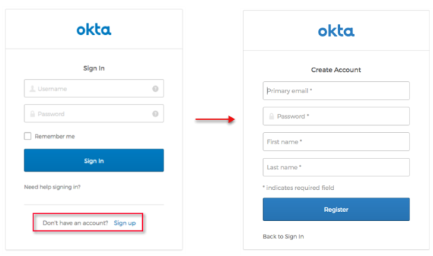 L'enregistrement en libre-service permet aux utilisateurs d'utiliser une application personnalisée ou la page d'accueil d'Okta pour s'enregistrer eux-mêmes. Après avoir activé SSR, un lien S'inscrire apparaît dans le Okta Sign-In widget. Les utilisateurs qui sélectionnent ce lien sont dirigés vers un nouveau formulaire d’enregistrement Créer un compte basé sur une stratégie d’inscription personnalisée.