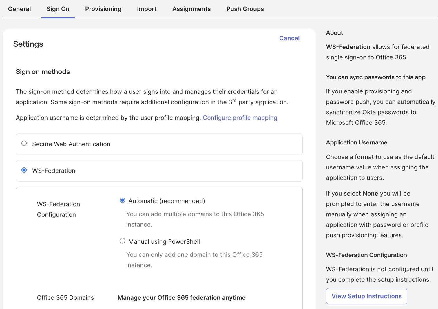 There's more configuration required on the target app (SP) that you're using to configure WS-Fed. Okta provides this information in our WS-Fed app instructions (accessible from the Sign on tab in the WS-Fed app page). The instructions contain the following: realm, issuer, passive URL (normally only needed in the SP-initiated flow mentioned previously). The configuration is app-dependent. Okta recommends that you check with your SP vendor to see if turning on WS-Fed is an all-or-nothing feature.