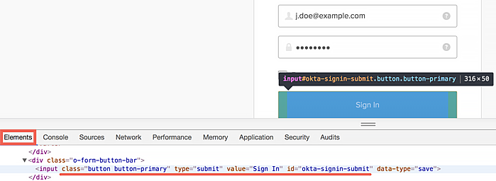 Il est possible que vous ayez besoin de la hiérarchie complète lorsque vous ne pouvez pas identifier de façon unique les éléments par les attributs id ou class. Pour la page de connexion d'Okta, les sélecteurs seraient les suivants :