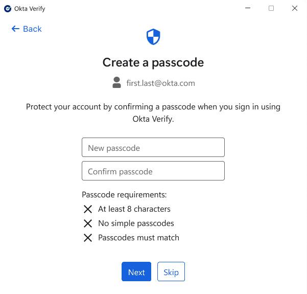 À partir de la version 4.9.0, Okta Verify pour Windows prend en charge la vérification de l'utilisateur avec un code d'accès Okta Verify.