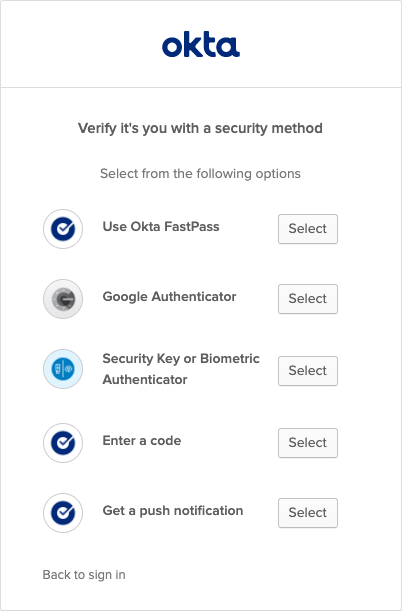 Sur la page de la méthode de sécurité, les utilisateurs choisissent l'une des options d'Authenticator primaire autorisées par les politiques de connexion à l'app et de session globale combinées.