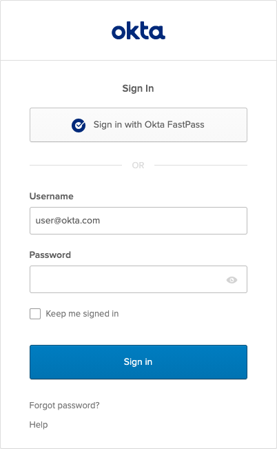 Si le facteur primaire d'une règle de politique de session globale est défini sur Mot de passe/IdP/tout facteur autorisé par les règles d'authentification de l'app, les utilisateurs voient le Sign-In Widget Identificateur en premier comme premier écran de leur flux d'accès.