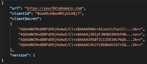 La valeur clientSecret de votre fichier okta_adfs_farm.json doit être un tableau JSON de chaînes protégées :